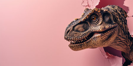 Close up view picture of the hollow pink hole on the the wall that show the t.rex stay inside the wall that has been made from some material yet still can break to look through the other side. AIGX03.