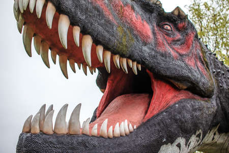Tyrannosaurus rex realistic model. Head close of dinosaur with open mouth