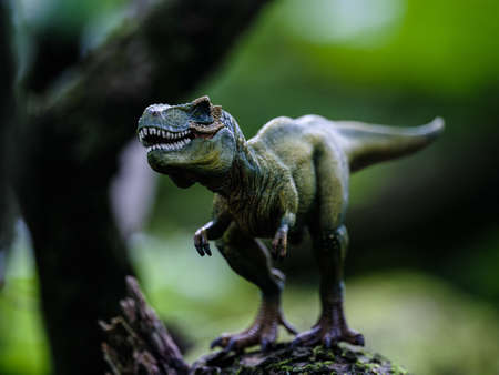 Toy dinosaur in the thicket imitates the natural environment. Toy for children.