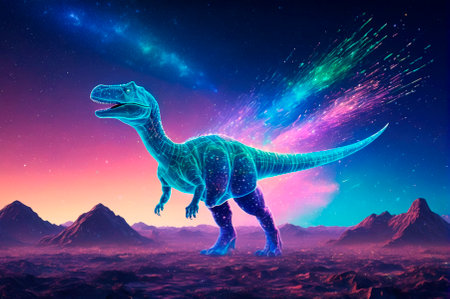 Holographic dinosaur consisting of many particles in the sky. Generative AI.
