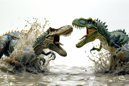 Two dinosaurs are fighting on a white background
