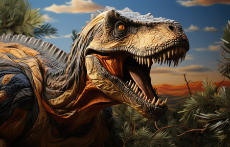 A detailed view of a dinosaur with its mouth wide open, showcasing its sharp teeth and powerful jaw muscles. The image captures the prehistoric reptile in a menacing pose, ready to strike or vocalize in its natural habitat.