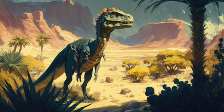Allosaurus in a whimsical and colorful style. In natural habitat. Jurassic Park