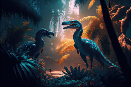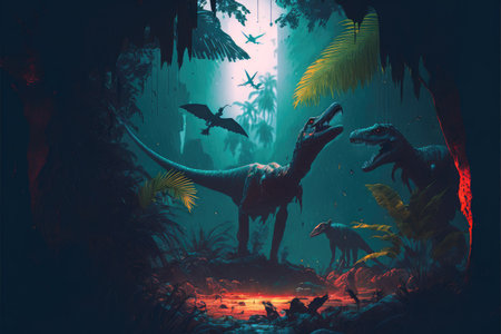 Fantasy in dinosaur or predator in the deep jungle scenery. Concept of prehistoric landscape in the Jurassic period of living life. Finest generative AI.