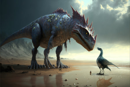 Prehistoric creature or dinosaur in the wild nature. Realistic style drawing. superlative generative AI image.