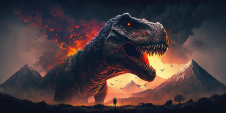 AI Generated. a fierce dinosaur emerges from the shadows showcasing its powerful jaws and intense gaze