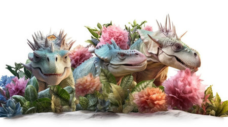 Colorful plastic dinosaur toys are arranged playfully on a bright white background, highlighting their vibrant colors and inviting imaginative play