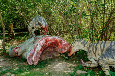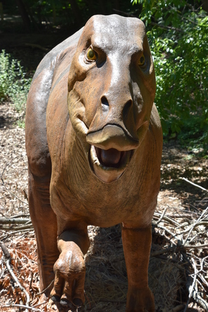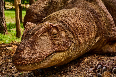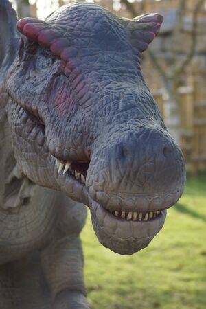 Close-up image of mean looking dinosaur in amusement dino park at Arboretum volcji potok near Radomlje in Slovenia.