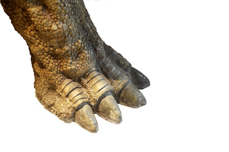 A realistic Tyrannosaurus rex paw in a Jurassic amusement park with space to copy. Paw on a background of green grass. High quality photo