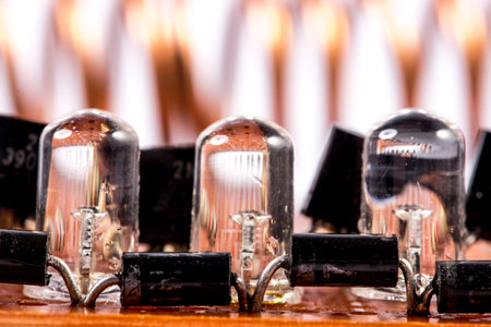 This image showcases vintage vacuum tubes on a circuit board, emphasizing intricate details and colorful glow, perfect for technology and design enthusiasts.
