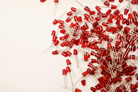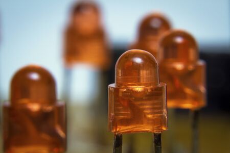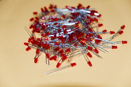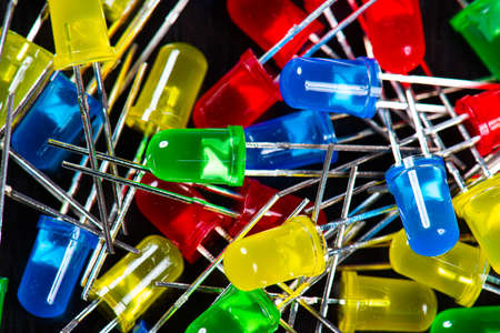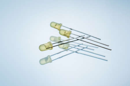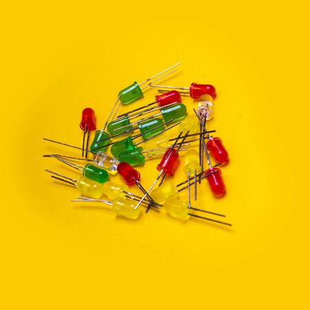 Small colorful LED diodes. Electroluminescent semiconductor light emitting source. Electrotechnical background. Red, blue, green or yellow transparent plastic electronic components over yellow