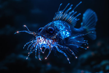 Bioluminescent deep-sea fish. A glowing, bioluminescent fish with intricate, luminous appendages and fins, swimming in a dark underwater environment.
