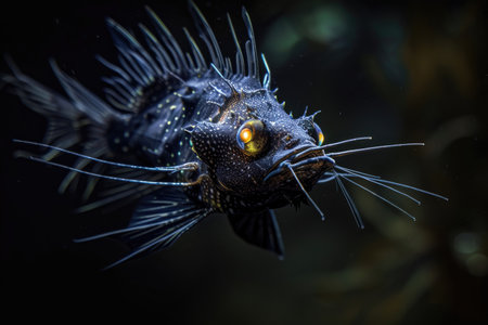 deep-sea anglerfish, with bioluminescent lure and eerie eyes, waiting in darkness, created with generative ai