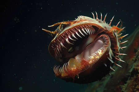 An ominous snapshot of a predatory mollusk lurking in the depths of the ocean