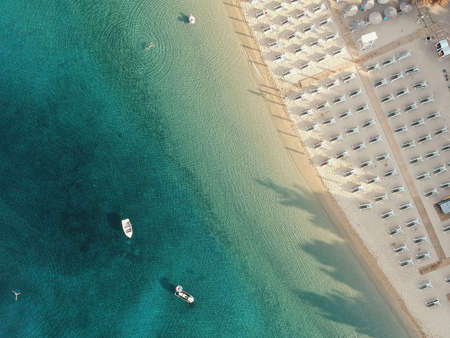 Hidden wild beach with sand against the green forest of the pine trees in Vourvourou, Sithonia, Greece. View from above