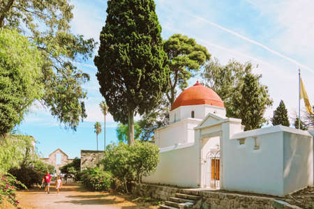 Ana Mera, Greece - September 24, 2019: Low angle view of bell towers on Panagia Tourliani Monastery, a whitewashed church and monastery on Mykonos dating from the 16th century.