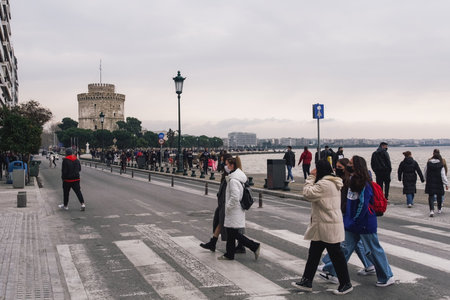 Thessaloniki, Greece - February 20 2021: People with covid-19 masks before the city landmark. Unidentified persons with face protection walk at the waterfront area of the White Tower.