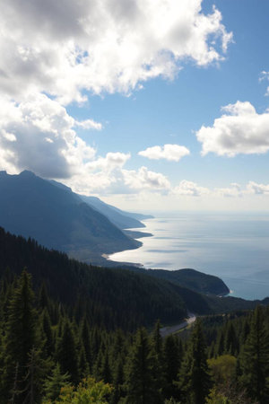 Vintage seascape and coastal nature background. Blue sea and mountains in the morning as art print