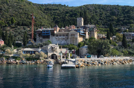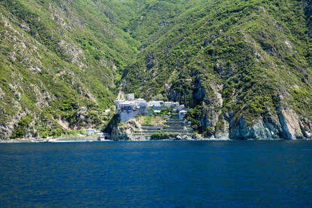 Athos peninsula, Greece. The Monastery of Dochiariou, founded in the 10th century, located in the Monks Republic on the peninsula of Athos. View from a ferry.