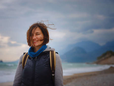 antalya, turkey, winter walk by the mediterranean sea. Attractive young woman standing on a windy cold beach.