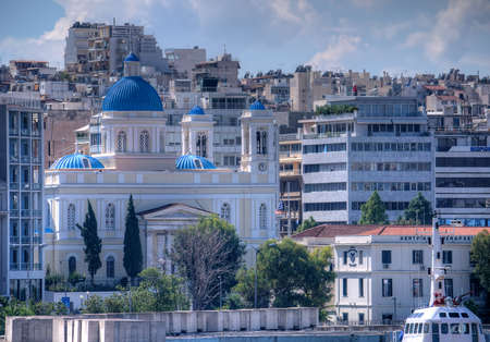 Athens, Greece - September 23, 2015. View of the capital of Greece Athens from the port. In the foreground with a typical greek church.