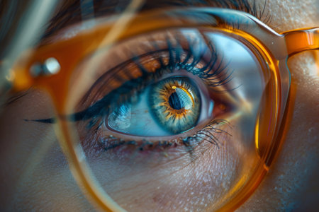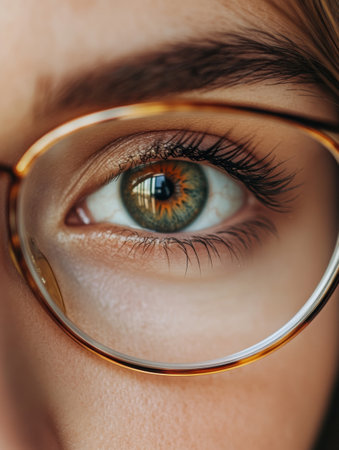 Detailed view of a female eye through glasses, highlighting the unique colors and reflections in the iris and eyelashes in soft lighting.