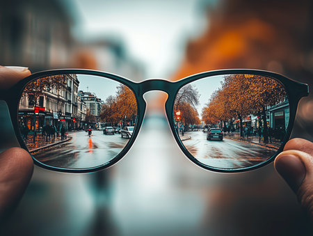 Reflective sunglasses revealing a vibrant city street on a rainy day