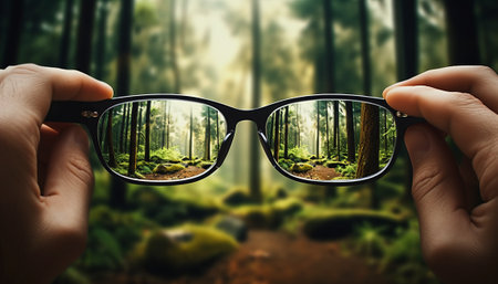 Woman's hand holding glasses on the background of a green forest.