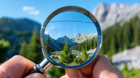 A stunning close-up of a magnifying glass reveals a breathtaking mountain landscape filled with pine trees under a clear blue sky, showcasing nature's beauty.