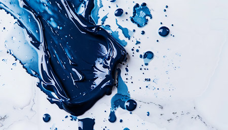 Pigment spill. Grunge flow. Gray blue marble liquid spreads over white wet abstract background surface. Defocused black leak spatter.