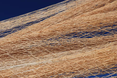 Nylon fishnet texture on the clear sky. Nautical marine background. Macro closeup.
