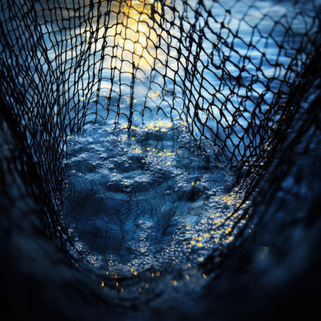 A captivating close-up view of a fishing net immersed in shimmering water. The soft reflections and gentle ripples create a serene atmosphere, perfect for nature enthusiasts.