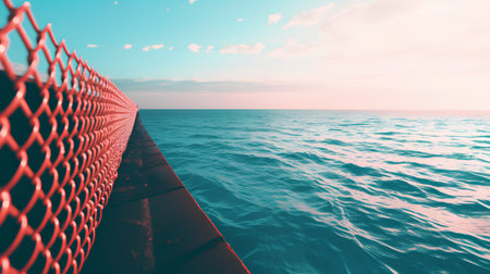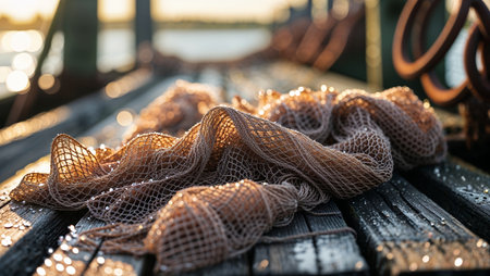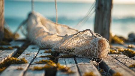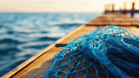 A close-up view of a blue fishing net draped on a wooden dock, with the serene ocean in the background and soft sunlight illuminating the scene. Concept: Fishing Net, Wooden Dock, Serene Ocean View