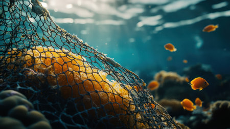 A ghost net entangled on coral, marine life suffering, underwater, pollution, ocean, fish, sunlight