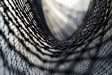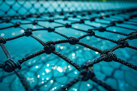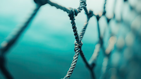 Close-up of black rope netting with detailed knots stretching over a vivid, sparkling blue water surface. ideal for nautical-themed designs, backgrounds, or textures, capturing the essence of marine life and aquatic environments. Generative AI