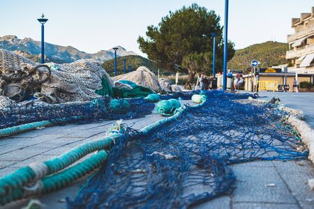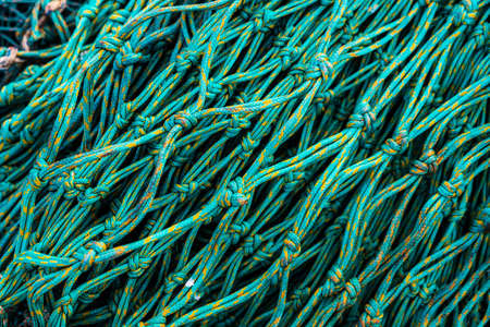 Close up view of fishing net in marine port in the morning. Selective focus. Blurred pattern background.