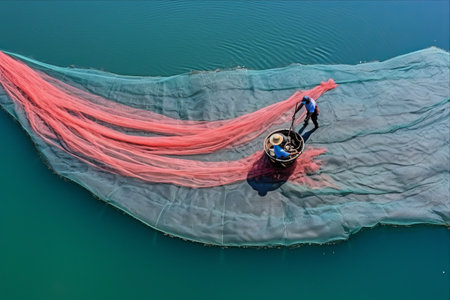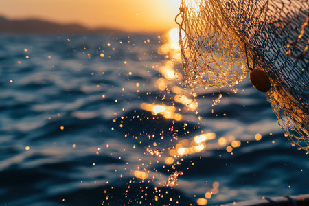 Traditional fishing net being thrown into a sparkling sea during sunset, highlighting maritime culture, livelihood, and ocean beauty.