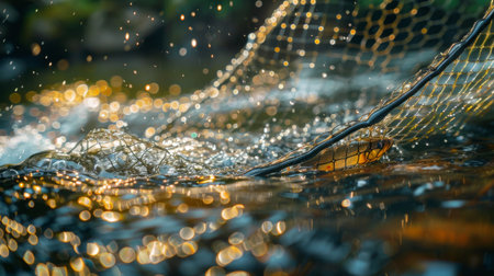 A beautifully lit fishing net sits against a shimmering water surface at sunset, creating a serene and artistic mood, perfect for nature-themed projects.