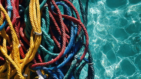 A close-up of a tangled sea of cables in various vibrant colors, against a backdrop of clear turquoise water, showcasing intricate patterns and textures
