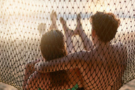 Chilling at the beach. Rear view shot of a young couple relaxing on a hammock at the beach.