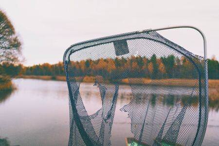 Torn fish net on the background of the autumn lake and boats in Latvia