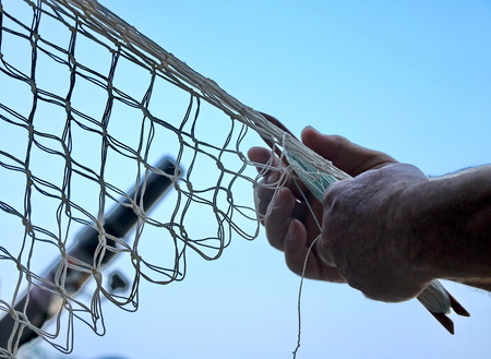 Fisherman repairs fishnets fishing lines