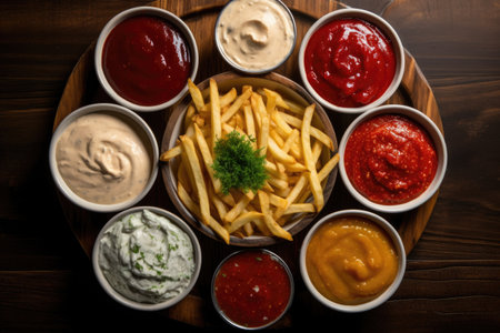 A variety of sauces and French fries are displayed on the table. These finger foods showcase the art of combining different ingredients to create delicious dishes in the world of cuisine