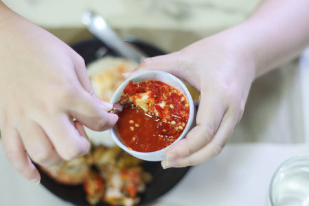 Person Dipping a Crab Leg into a Sauce Bowl Lifted Above a Rice Plate
