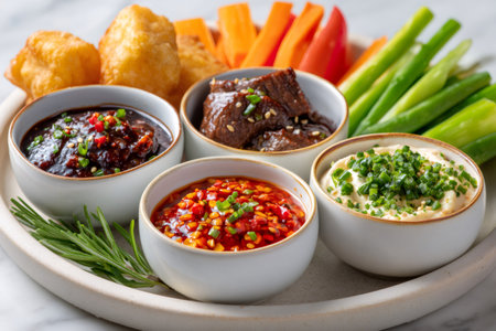 Platter presenting multiple savory sauces, fried snacks, and vegetable sticks