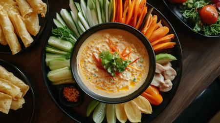 A high-angle view of a beautifully plated Thai dish with a bowl of in the center, surrounded by an array of dipping vegetables and condiments, creating an inviting and colorful meal.