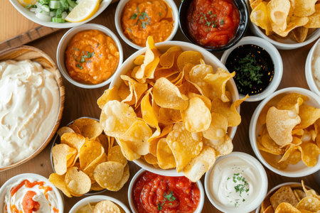 A delectable selection of tortilla chips accompanied by a variety of dips and sauces. Ideal for parties or a flavorful snack experience