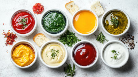 A selection of colorful sauces in small rustic bowls, artfully arranged on a clean white surface, viewed from above, perfect for culinary presentations