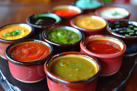 A visually appealing arrangement of various sauces and condiments in small bowls, showcasing a rich diversity of flavors and textures for culinary adventures.