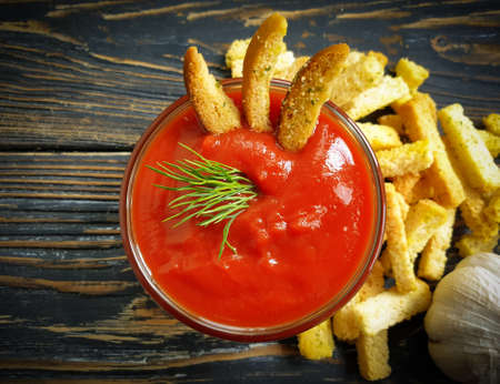 ketchup, bread croutons on a wooden background